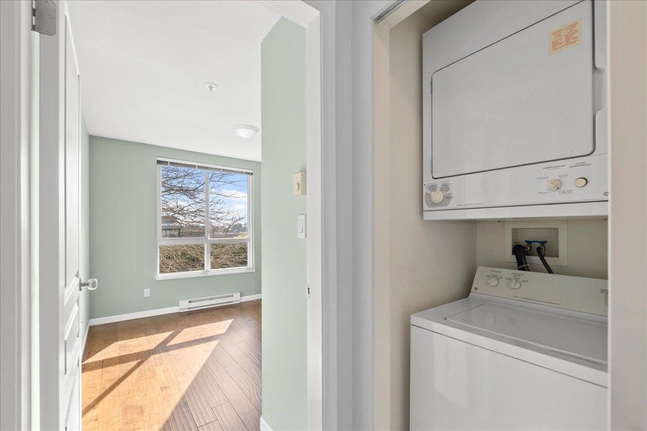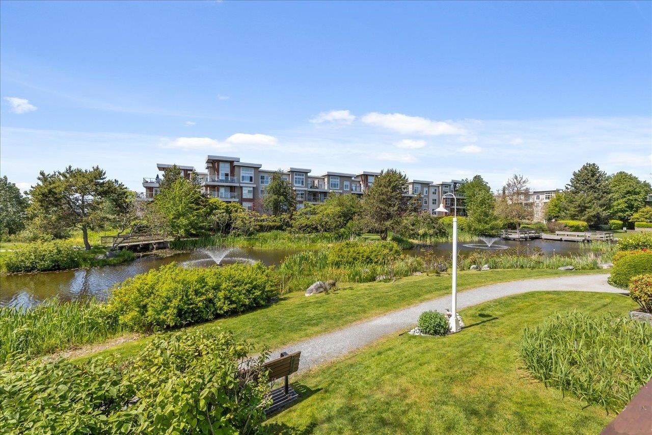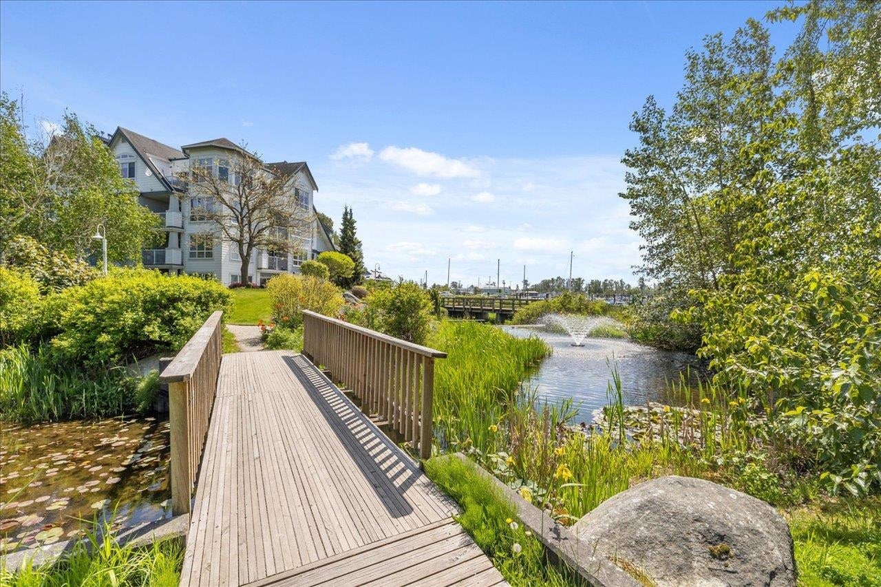 Welcome to Nautica South! This bright and spacious 2 bedroom, 2 bathroom CORNER suite has plenty to offer including a functional layout with a generous living room, large primary bedroom complete with a cozy window seat, walk in closet and ensuite. Other features include handscraped, engineered hardwood throughout, 2 tandem parking stalls, a storage locker across the hall on the same floor. Hot water and gas included in the maintenance fee. Steps to walking trails, coffee shops, restaurants, the marina and everything else that charming Steveston has to offer.